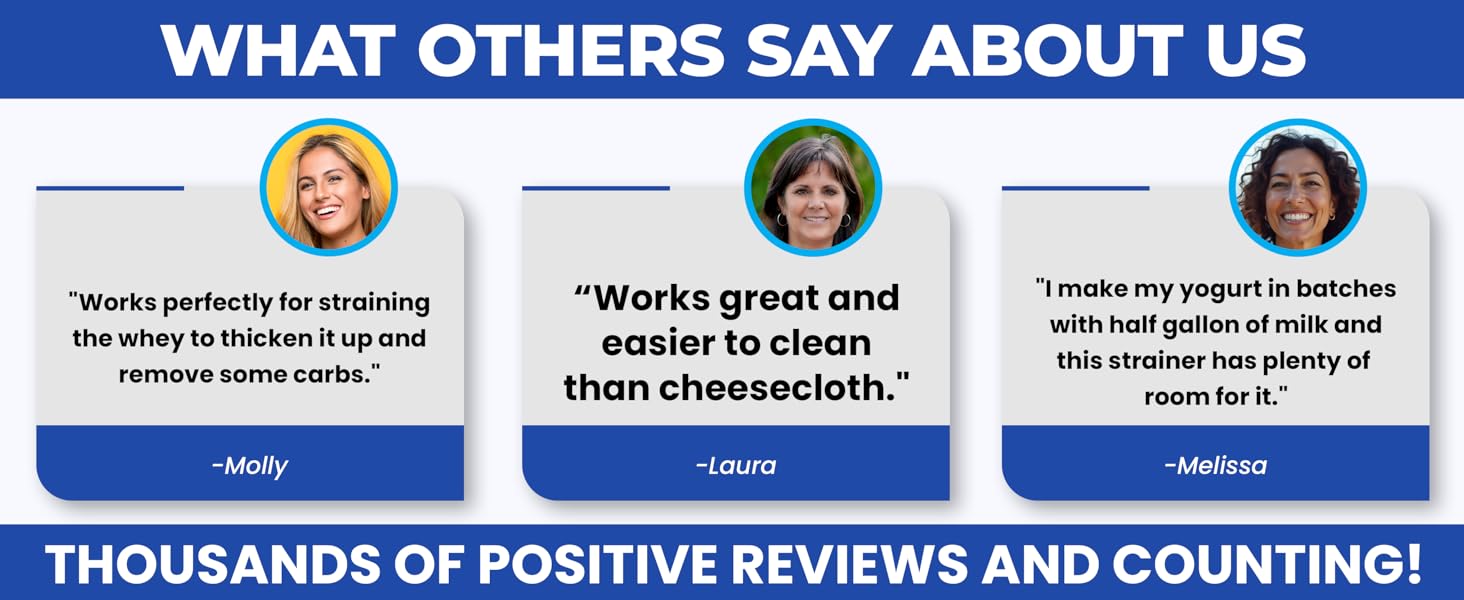 It has Nylon mesh for optimal whey separation Durable and easy to clean Use it with a Greek yogurt starter or for the best dry yogurt maker. Our yogurt bag is for you. This is the best yogurt maker accessory on the market! The strainer makes a perfect kitchen gift for women, chefs and cooks. Get it as a Birthday present for mom.