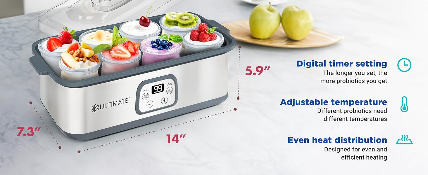 - 𝗔𝗱𝗷𝘂𝘀𝘁𝗮𝗯𝗹𝗲 𝗧𝗲𝗺𝗽𝗲𝗿𝗮𝘁𝘂𝗿𝗲 𝗖𝗼𝗻𝘁𝗿𝗼𝗹 & 𝗥𝘂𝗻 𝗧𝗶𝗺𝗲 - 𝟭𝟬𝟬% 𝗕𝗣𝗔-𝗙𝗥𝗘𝗘 - The Ultimate Probiotic Yogurt Maker has adjustable temperature settings from 68-131°F and can run for up to 48 hours, ensuring the perfect environment to culture your yogurt for tons of probiotics. The machine is 100% BPA free and comes with two large glass containers with BPA free lids to ensure the health of you and your family.